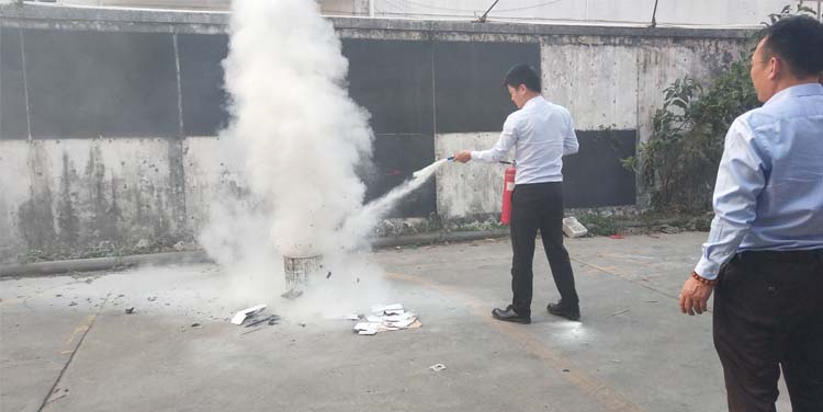 公司消防隊員使用手提式干粉滅火器進行滅火演示,全體員工現(xiàn)場觀看。