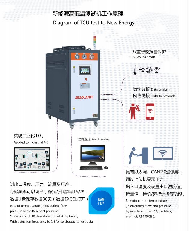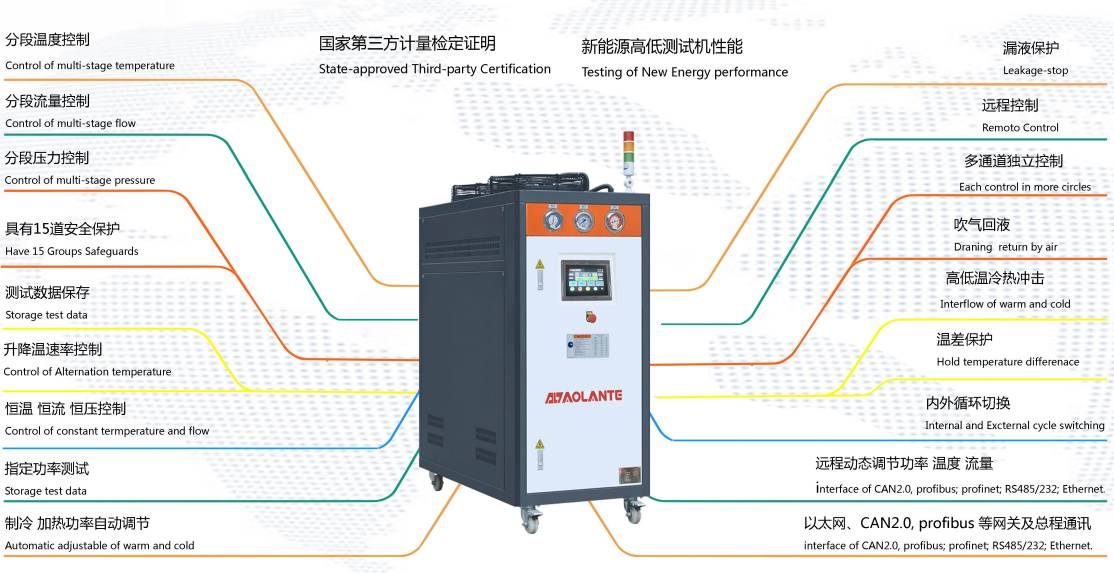 深圳奧蘭特機械開發(fā)的新能源動力電池液冷測試系統(tǒng)、電池包恒溫冷卻系統(tǒng)溫度控制范圍-60~110℃,流量2-100L/min,壓力恒定0~400Kpa;控溫精度:±0.1℃,壓力控制精度±0.1L。數(shù)據(jù)精度都由國際第三方檢測機構出具證書。