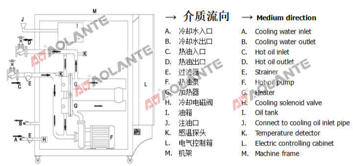傳熱媒體(油)通過I(油箱)進(jìn)入系統(tǒng),由F(循環(huán)油泵)打到模具后再回到系統(tǒng),周而復(fù)始。媒體(油)在經(jīng)過G(加熱器)升溫,由K(感溫探頭)探測媒體(油)溫度,當(dāng)溫度達(dá)到要求時,G(加熱器)停止工作。當(dāng)溫度需要下降時,H(電磁閥)打開,冷卻水由A經(jīng)過B到H(電磁閥)進(jìn)入熱交換器,熱交換器里的熱水經(jīng)過B排到冷卻水塔,從而間接使熱循環(huán)油系統(tǒng)內(nèi)溫度下降。
