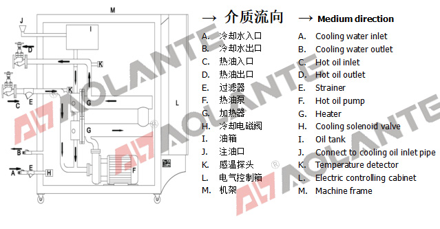 傳熱媒體(油)通過I(油箱)進入系統(tǒng),由F(循環(huán)油泵)打到模具后再回到系統(tǒng),周而復始。媒體(油)在經過G(加熱器)升溫,由K(感溫探頭)探測媒體(油)溫度,當溫度達到要求時,G(加熱器)停止工作。當溫度需要下降時,H(電磁閥)打開,冷卻水由A經過B到H(電磁閥)進入熱交換器,熱交換器里的熱水經過B排到冷卻水塔,從而間接使熱循環(huán)油系統(tǒng)內溫度下降。