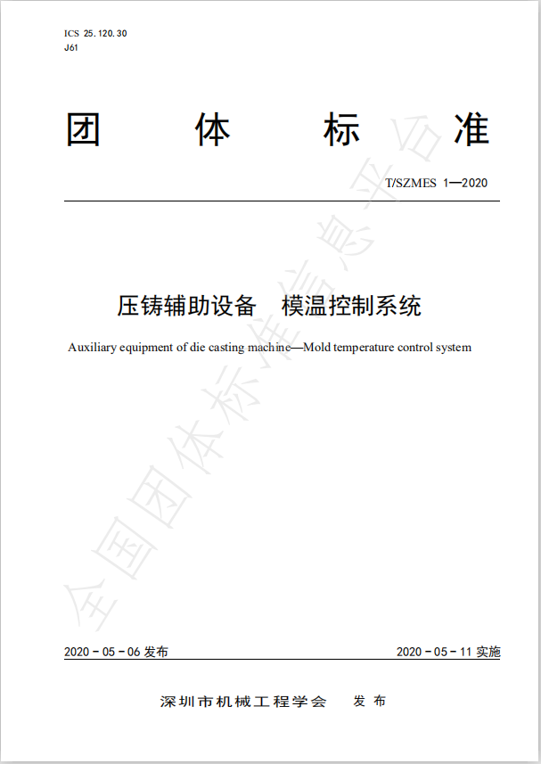 中國(guó)模溫機(jī)也有標(biāo)準(zhǔn)啦!由深圳市機(jī)械工程學(xué)會(huì)在全團(tuán)體標(biāo)準(zhǔn)信息平臺(tái)2020年5月6日發(fā)布,2020年5月11日實(shí)施:壓鑄輔助設(shè)備 模溫控制系統(tǒng)(壓鑄模溫機(jī))、壓鑄用模溫控制系統(tǒng) 能耗測(cè)試及等級(jí)評(píng)定方法的團(tuán)體標(biāo)準(zhǔn),本標(biāo)準(zhǔn)按照GB/T 1.1—2009給出的規(guī)則起草,由深圳市機(jī)械工程學(xué)會(huì)提出與歸口,起草單位蘇州奧德、深圳市奧蘭特機(jī)械、深圳大學(xué)、深圳市機(jī)械工程學(xué)會(huì)等十家相關(guān)企業(yè)天。壓鑄模溫機(jī)標(biāo)準(zhǔn)化的誕生,是模溫控制系統(tǒng)跨出了一小步,中國(guó)民企跨出了一大步。